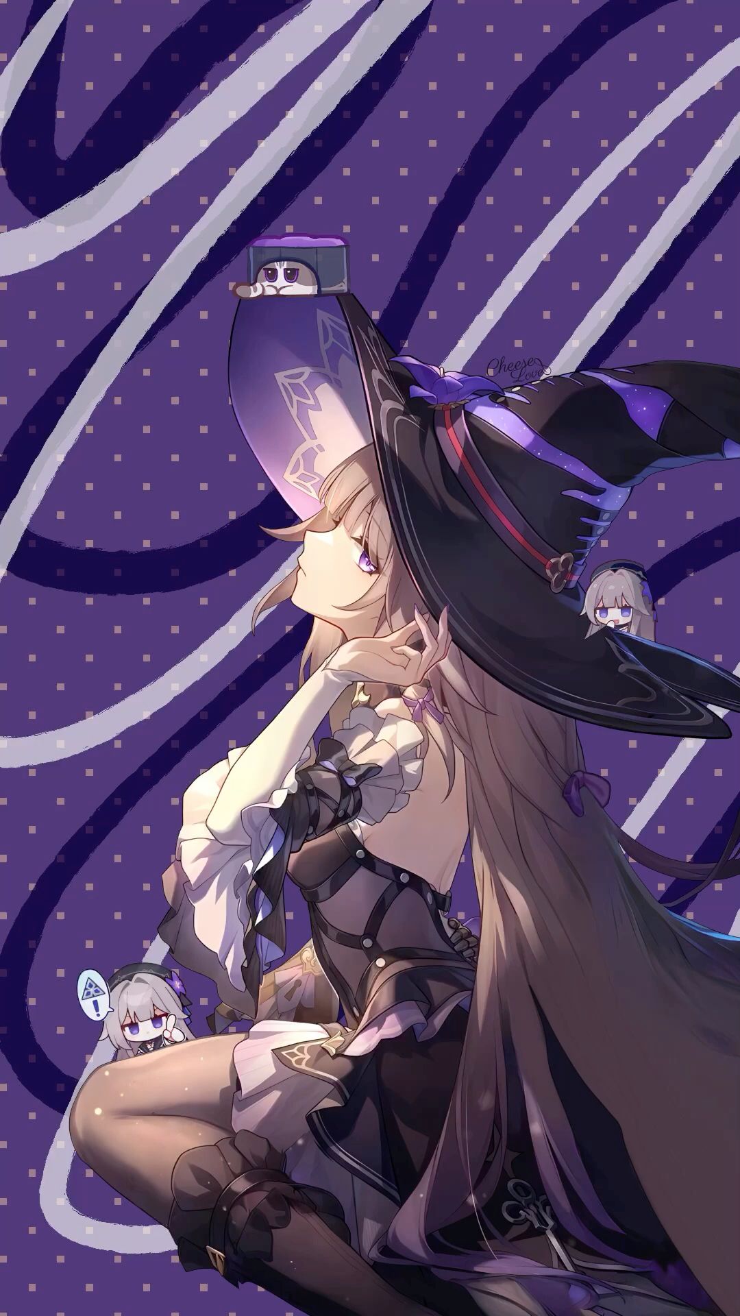 The Herta wallpaper, Honkai Star Rail, 4K anime wallpaper, high resolution, witch hat anime girl, Herta fan art, purple anime background, Honkai Star Rail character, anime wallpaper 2024, chibi Herta