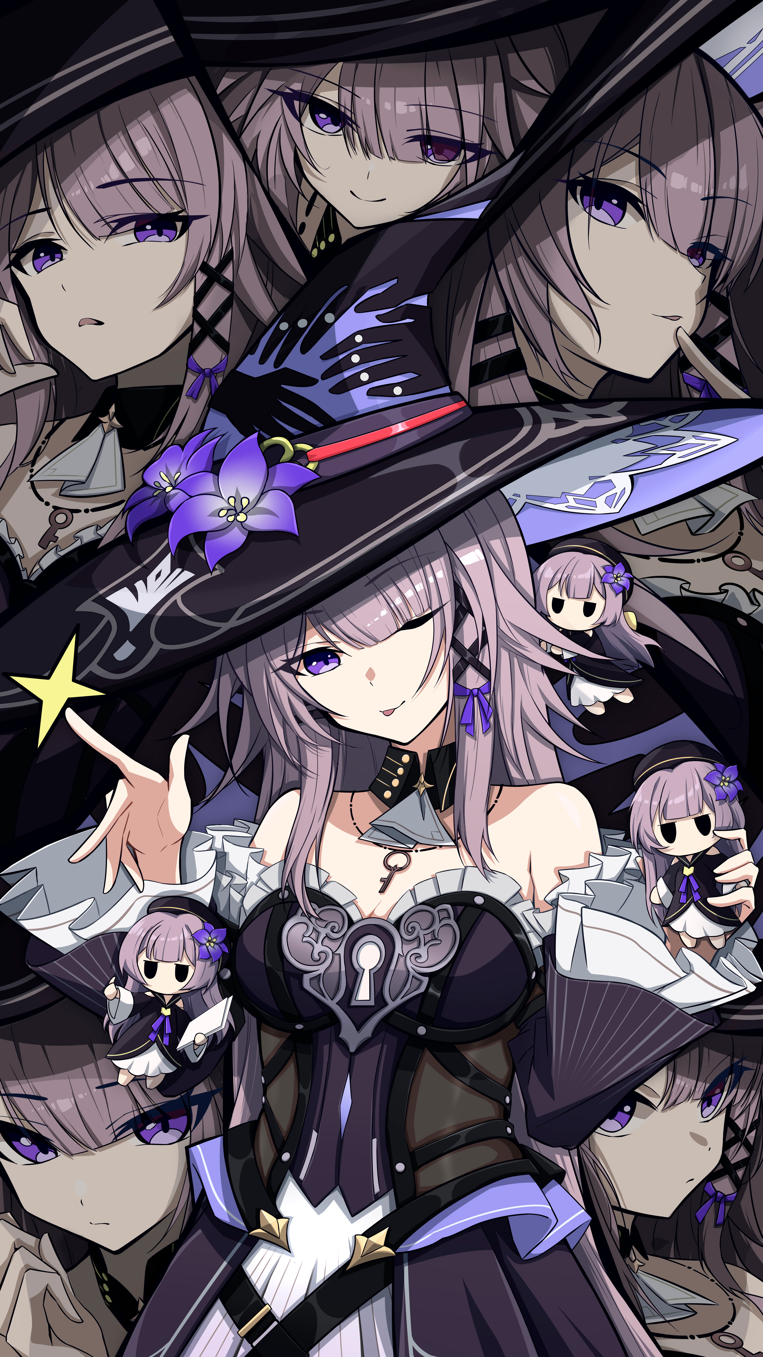 Stunning 4K high-resolution wallpaper featuring The Herta from Honkai: Star Rail in her elegant witch outfit. Showcases multiple expressions and chibi versions with purple eyes, dark magic hat, and gothic aesthetic.