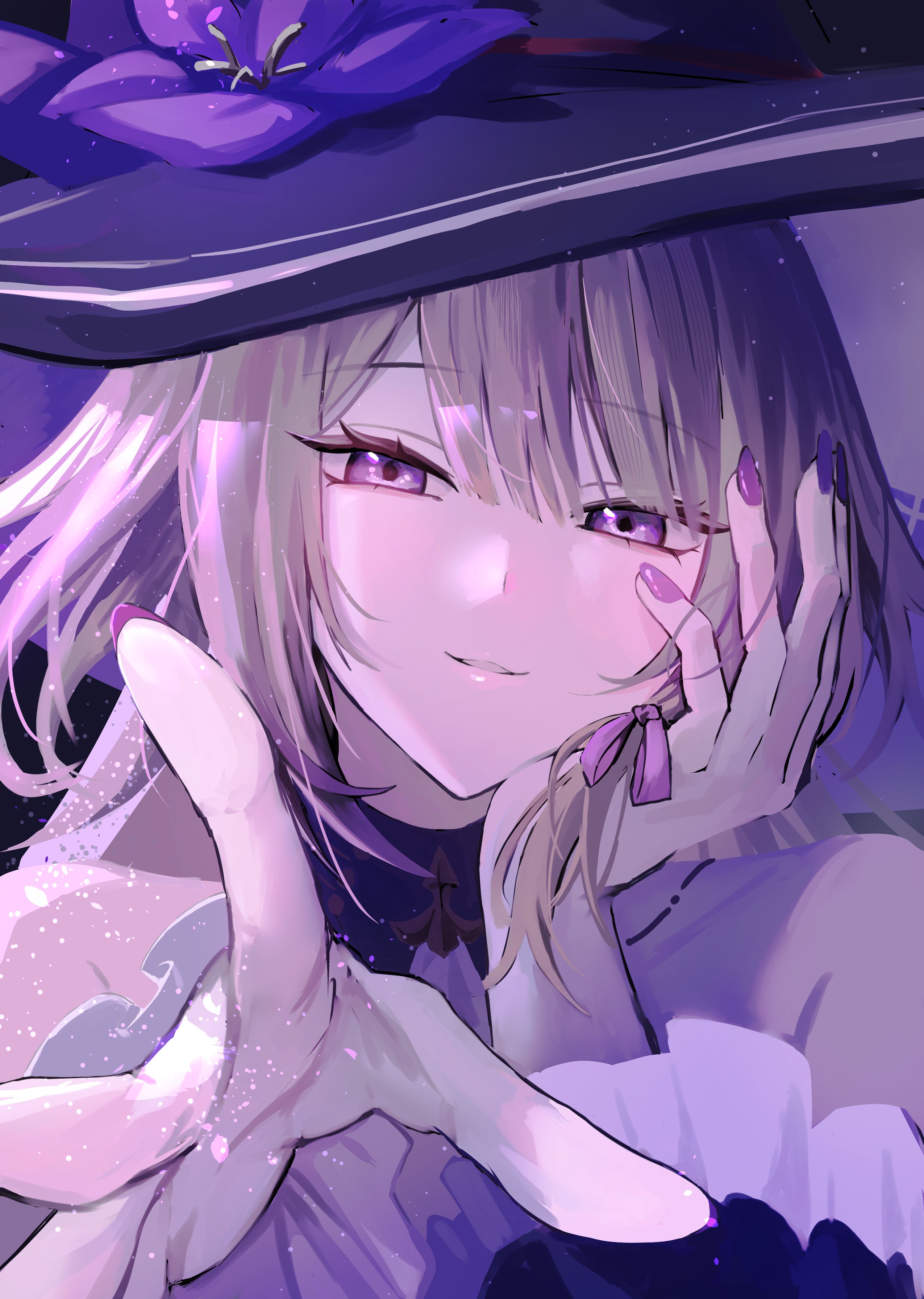 Stunning 4K high-resolution fan art wallpaper of The Herta from Honkai: Star Rail, featuring her iconic witch hat, glowing violet eyes, silver hair, and elegant purple nails in a close-up mystical portrait.