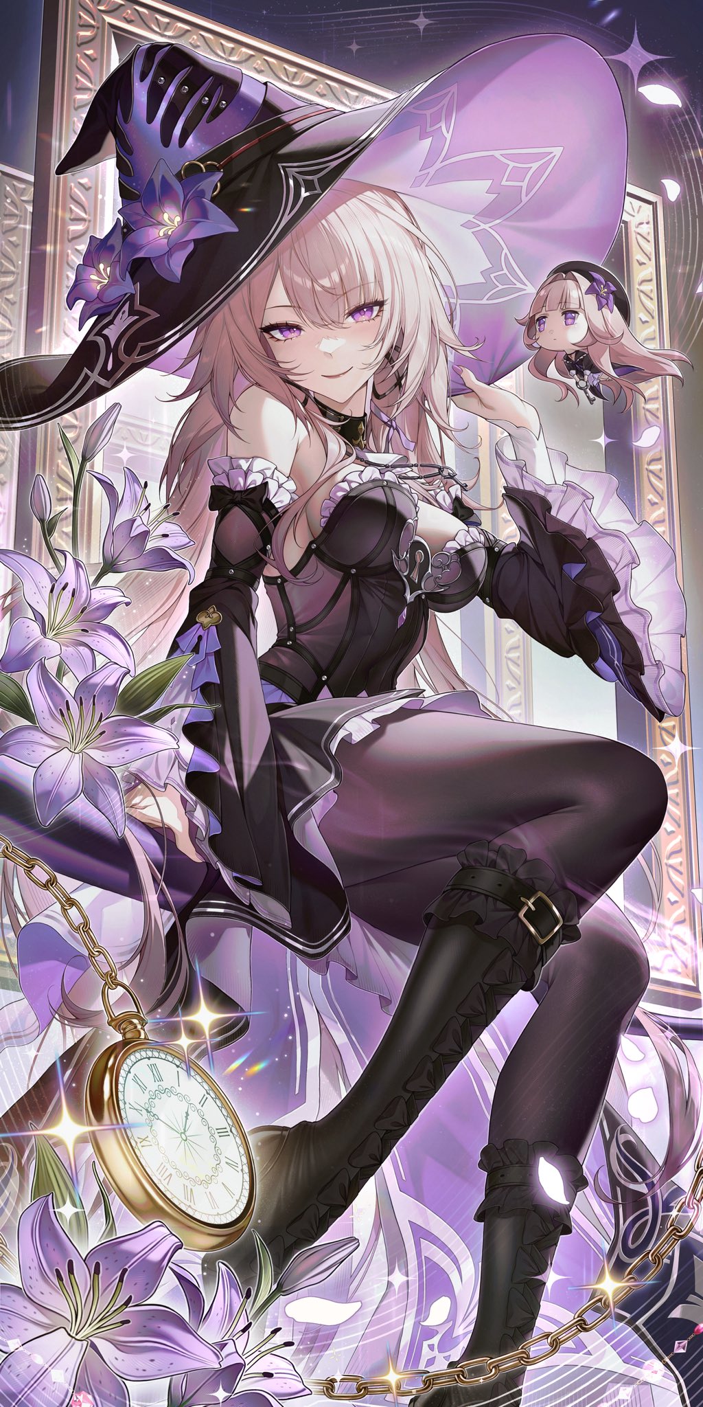 Stunning 4K wallpaper of The Herta from Honkai: Star Rail, dressed in an elegant black witch outfit with a wide-brim hat, purple flowers, and a golden pocket watch. High-resolution anime art.