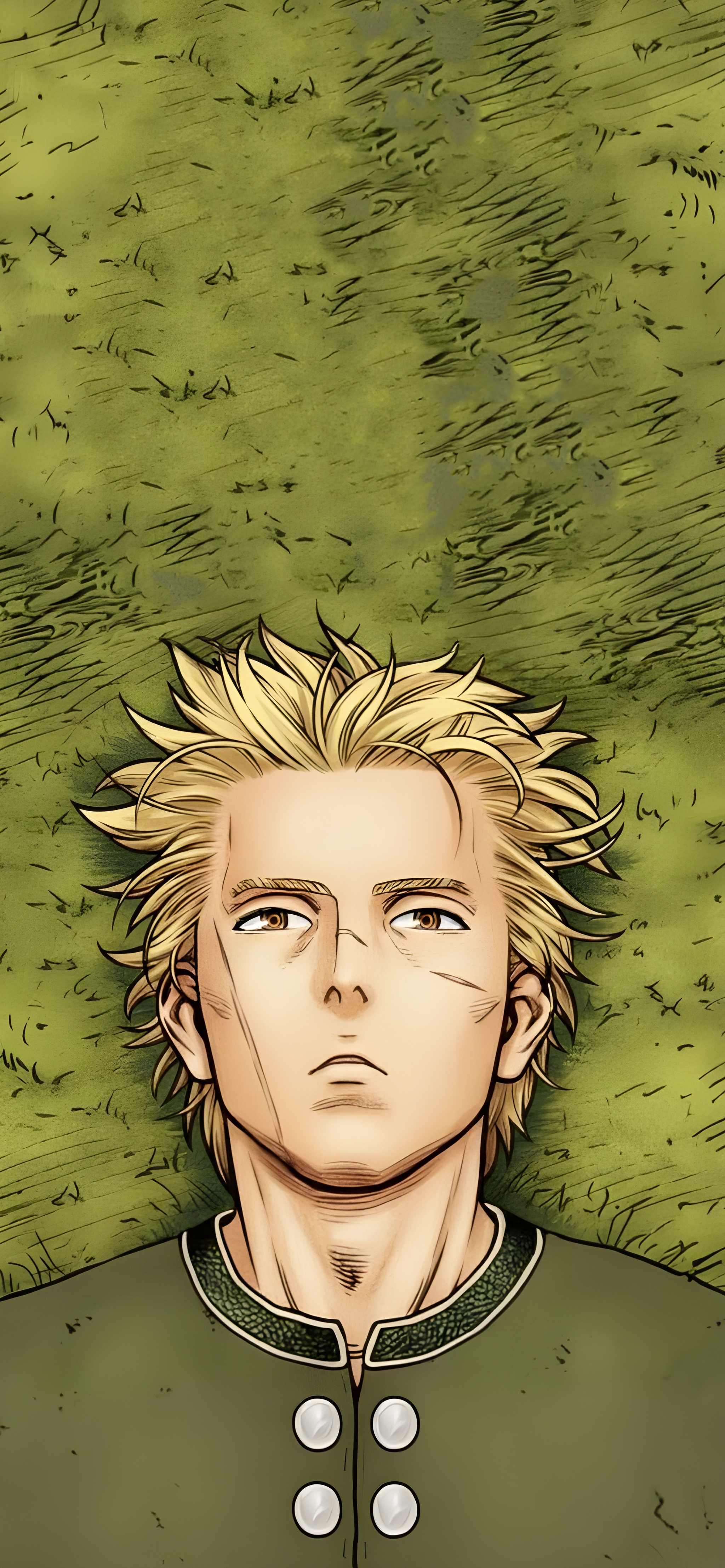Stunning 4K high-resolution wallpaper of Thorfinn from Vinland Saga, lying peacefully on green grass with a contemplative gaze. Beautifully detailed manga-style artwork with vibrant colors and crisp linework.