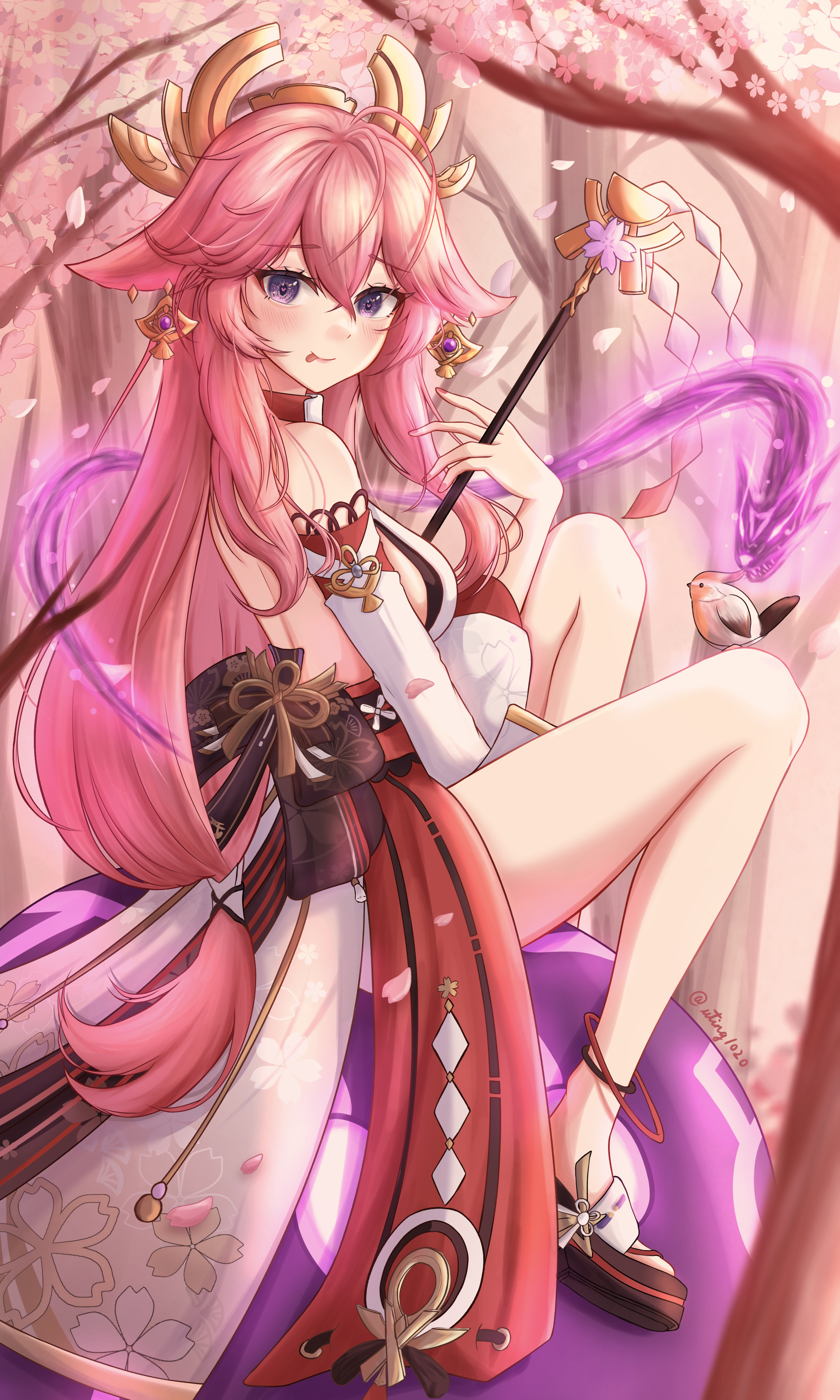 Yae Miko, Genshin Impact, anime wallpaper, 4K resolution, cherry blossom, shrine maiden, pink hair, high quality, gaming art, Japanese aesthetic