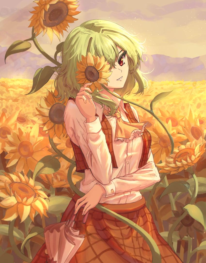 Yuuka Kazami, Touhou Project, sunflower field wallpaper, 4K anime wallpaper, high resolution anime art, Touhou wallpaper, anime girl sunflowers, ultra HD wallpaper, summer anime scenery, Touhou fan art